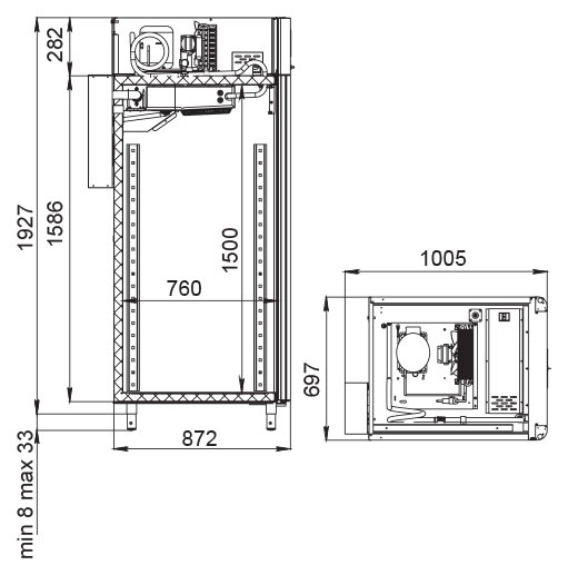 Каталог оборудования Холодильное оборудованиеШкафы холодильныеСпециализированные холодильные шкафыШкаф холодильный для вызревания салями Polair CS107 Salami черный, со стеклом Шкаф холодильный для вызревания салями Polair CS107 Salami черный, со стеклом Код товара: 062-632 Поделиться: WhatsAppTelegram СравнитьДобавить в КПВ избранное 0 373 915 ₽ В корзину 0 шт Под заказСамовывоз сегодня бесплатно Взять в кредит Купить в лизинг Получить консультацию в WhatsApp Описание Характеристики Отзывы 0 Инструкции 5 Шкаф холодильный для вызревания салями Polair CS107 Salami черный, со стеклом предназначен для приготовления и хранения салями, сыровяленых колбас и других мясных деликатесов на предприятиях общественного питания и торговли. Цельнозаливной монолитный корпус выполнен из нержавеющей стали снаружи и внутри (кроме задней стенки), что обеспечивает высокую прочность, долговечность и удобство ухода. Оборудование рассчитано на работу при температуре окружающей среды до +40 °С. Особенности: Динамическое охлаждение с мягким обдувом без заветривания Верхнее расположение агрегата Автоматическая оттайка с системой испарения конденсата Русифицированная многофункциональная панель управления с дисплеем диагональю 5" Возможность создания и сохранения индивидуальных программ Встроенный ультразвуковой увлажнитель (необходима подача очищенной воды и подключение к канализации) UV-лампа для обеззараживания воздуха внутри камеры Три уровня подвесов с тремя перекладинами и крюками на каждом уровне для удобной развески колбас Регулируемый уровень влажности: от 60 до 95 % Распашная дверь с заливной теплоизоляцией, встроенной ручкой и магнитным уплотнителем Отключаемая LED-подсветка камеры Штампованное углубление в дне корпуса для удобства ухода Педаль для удобного открытия двери Хладагент R290 (пропан) Толщина стенки корпуса: 43 мм Polair CS107 Salami черный, со стеклом — это профессиональный холодильный шкаф, идеально подходящий для цехов, гастробаров и мясных мастерских. Он обеспечивает оптимальные условия для дозревания и хранения деликатесов за счёт точного контроля температуры и влажности, продуманной конструкции и расширенного функционала. Такой шкаф помогает сохранять качество и вкус продукции на высоком уровне.Изображение товара, представленного на фото, может отличаться от его фактического вида. Показать все Габаритные размеры697×1005×1960 ммДиапазон рабочей температурыот -2 до +30 °CДлина697 ммШирина1005 ммВысота1960 ммОбъём700 лКол-во дверей1 Тип двериСтеклянная Уровень влажностиот 60 до 95 %Холодильный агрегатВстроенный Тип оттайкиАвтоматическая Тип охлажденияДинамическое ПодсветкаЕсть UV-лампаЕсть ХладагентR290 Вес нетто160 кгВес брутто190 кгБрендPolairВсе специализированные холодильные шкафы Из нержавейкиВсе специализированные холодильные шкафы Стеклянная дверь Оставить отзыв Еще никто не оставил отзыв на этот товар Схема POLAIR CS107 Salami.jpgИнструкция на POLAIR CS107 Salami.pdfБрошюра на POLAIR CS107 Salami.pdfДекларация о соответствии.pdfСертификат соответствия.pdf Похожие товары Перейти в каталог Под заказ 391 000 ₽ Шкаф холодильный для вызревания сыра Polair CS107 Cheese полки нерж. Под заказ 207 942 ₽ Шкаф холодильный HURAKAN HKN-MA350 для созревания мяса Под заказ 414 545 ₽ Шкаф холодильный для хлебопекарных производств Polair CS107-Bakery Br со стеклом (Тип 1) Под заказ 389 300 ₽ Шкаф холодильный для вызревания мяса Polair CS107 Meat черный, со 