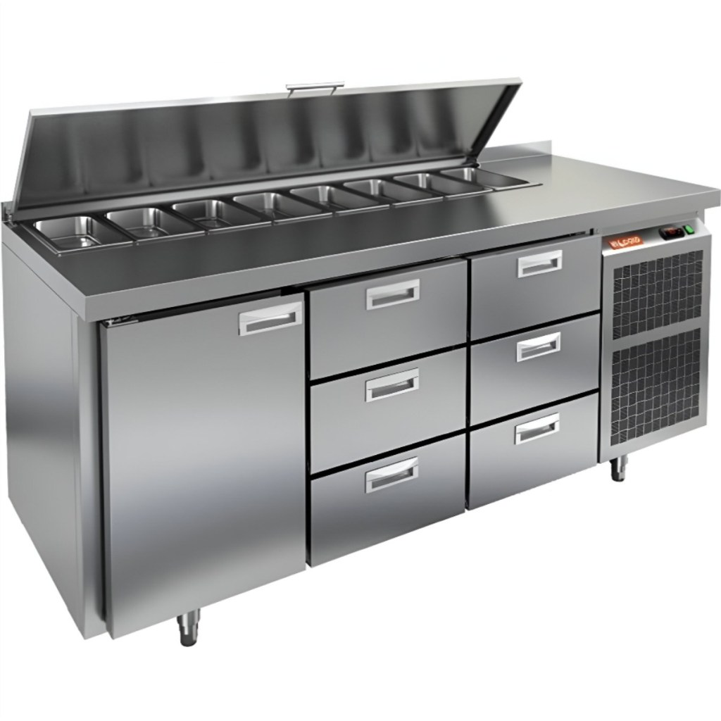 Каталог оборудования Холодильное оборудованиеСтолы охлаждаемыеСтолы холодильные для салатовСтол холодильный для салатов HiCold SL1-133GN (1/3) с крышкой Стол холодильный для салатов HiCold SL1-133GN (1/3) с крышкой Код товара: 064-848 Поделиться: WhatsAppTelegram СравнитьДобавить в КПВ избранное 0 209 962 ₽ В корзину 0 шт Под заказСамовывоз сегодня бесплатно Взять в кредит Купить в лизинг Получить консультацию в WhatsApp Описание Характеристики Отзывы 0 Стол холодильный для салатов HiCold SL1-133GN (1/3) предназначен для использования на предприятиях общественного питания и торговли. Он объединяет рабочую поверхность и охлаждаемый отсек, что делает его удобным решением для хранения, охлаждения и подготовки ингредиентов при приготовлении салатов, пиццы и других блюд. Такая конструкция позволяет повару работать быстрее и эффективнее, так как все необходимые продукты находятся под рукой. Корпус и столешница выполнены из прочной нержавеющей стали, устойчивой к коррозии и легко поддающейся санитарной обработке. Металлическая крышка защищает продукты от загрязнений и сохраняет их свежесть. Особенности модели: Электронная панель управления — точная настройка температурного режима. 1 глухая дверь — удобный доступ к холодильному отсеку. 6 выдвижных ящика — быстрое размещение и замена продуктов. Вместимость салат-бара — до 8 гастроемкостей глубиной до 100 мм. Автоматические доводчики дверей с фиксацией в открытом положении. Легкозаменяемые магнитные уплотнители — надежная герметичность. Открытая агрегатная часть — быстрый доступ для обслуживания. Регулируемые по высоте ножки — устойчивость даже на неровном полу. Толщина столешницы, борта и теплоизоляции — 50 мм, что обеспечивает прочность и энергоэффективность конструкции. HiCold SL1-133GN (1/3) — практичное и удобное решение для профессиональной кухни, обеспечивающее удобную подготовку и хранение ингредиентов. Изображение товара, представленного на фото, может отличаться от его фактического вида. Показать все Габаритные размеры1835×700×850 ммДиапазон рабочей температурыот +2 до +10 °CРасположение агрегатаБоковое Материал столешницыНержавеющая Тип столаС дверьми и ящиками Тип двериГлухая Объём505 лКоличество дверей1 штТип гастроемкостейGN 1/3 Количество ящиков6 штРазмер полки530×325 ммНапряжение220 ВМощность0,46 кВтТип охлажденияДинамическое Тип оттайкиАвтоматическая СтолешницаС бортом Габариты в упаковке2000×850×1000 ммВес нетто130 кгВес брутто185 кгБрендHicold Оставить отзыв Еще никто не оставил отзыв на этот товар Ранее просмотрено Под заказ 235 162 ₽ Стол холодильный для салатов HiCold SLE1-222GN (1/3) О без крышки Под заказ 255 412 ₽ Стол холодильный для салатов HiCold SL1-222GN (1/3) без крышки Под заказ 139 671 ₽ Стол холодильный для салатов HiCold SL1-11SN (1/3) О без крышки Под заказ 166 222 ₽ Стол холодильный для салатов HiCold SL1-11GN (1/3) О М с крышкой В наличии 162 702 ₽ Шкаф морозильный с глухой дверью TEFCOLD GUF70 нержавеющий Под заказ 259 191 ₽ Агрегат компрессорный-конденсаторный МХМ БКК ZB-30 В наличии 115 912 ₽ Витрина кондитерская Kayman K-ВК-900 люкс квадро серебро