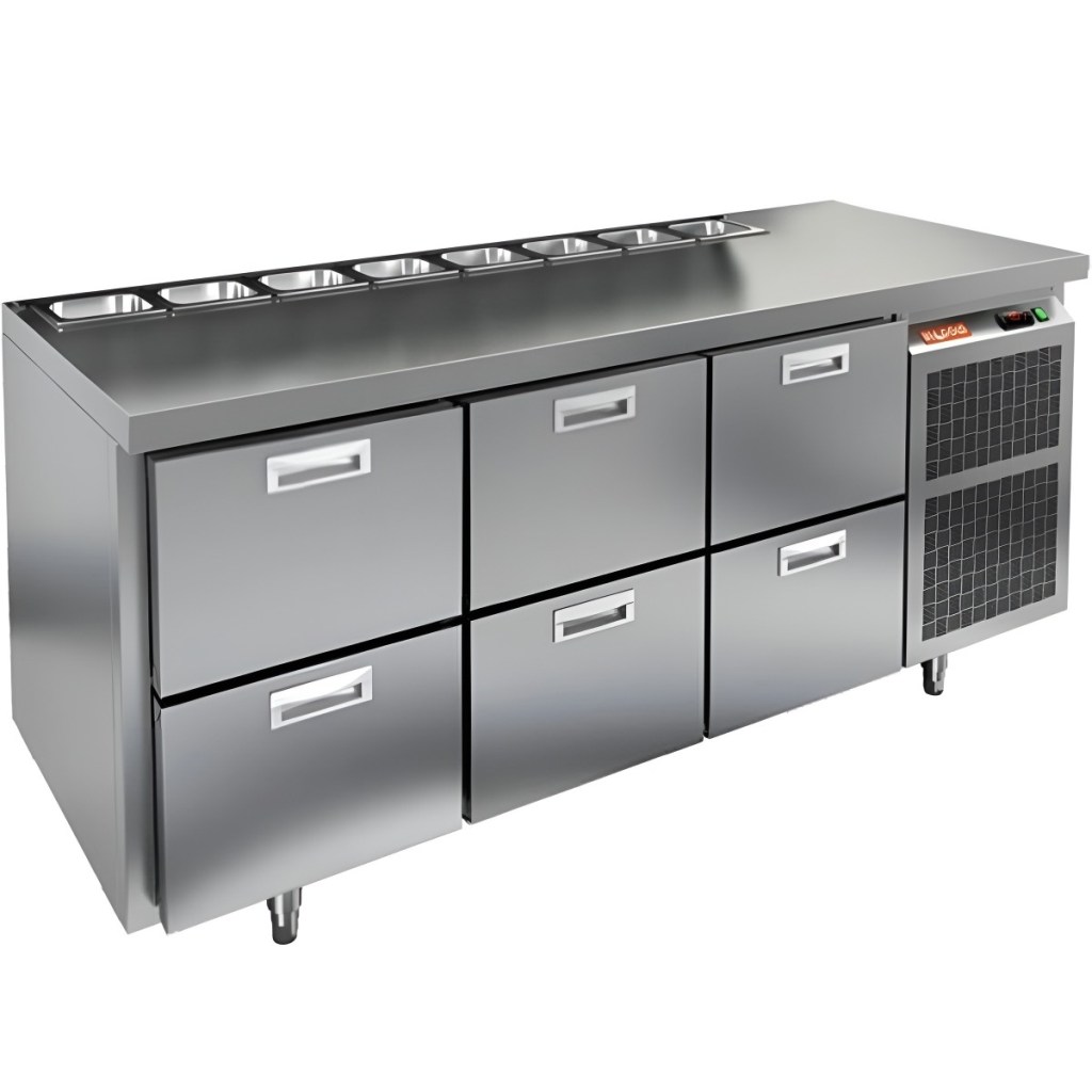 Каталог оборудования Холодильное оборудованиеСтолы охлаждаемыеСтолы холодильные для салатовСтол холодильный для салатов HiCold SL1-222GN (1/3) О без крышки Стол холодильный для салатов HiCold SL1-222GN (1/3) О без крышки Код товара: 064-850 Поделиться: WhatsAppTelegram СравнитьДобавить в КПВ избранное 0 255 412 ₽ В корзину 0 шт Под заказСамовывоз сегодня бесплатно Взять в кредит Купить в лизинг Получить консультацию в WhatsApp Описание Характеристики Отзывы 0 Стол холодильный для салатов HiCold SL1-222GN (1/3) О без крышки предназначен для использования на предприятиях общественного питания и торговли. Он объединяет рабочую поверхность и охлаждаемый отсек, что делает его удобным решением для хранения, охлаждения и подготовки ингредиентов при приготовлении салатов, пиццы и других блюд. Такая конструкция позволяет повару работать быстрее и эффективнее, так как все необходимые продукты находятся под рукой. Корпус и столешница выполнены из прочной нержавеющей стали, устойчивой к коррозии и легко поддающейся санитарной обработке. Особенности модели: Электронная панель управления — точная настройка температурного режима. 9 выдвижных ящика — быстрое размещение и замена продуктов. Вместимость салат-бара — до 8 гастроемкостей глубиной до 100 мм. Автоматические доводчики — комфорт при загрузке/выгрузке. Легкозаменяемые магнитные уплотнители — надежная герметичность. Открытая агрегатная часть — быстрый доступ для обслуживания. Регулируемые по высоте ножки — устойчивость даже на неровном полу. Толщина столешницы, и теплоизоляции — 50 мм, что обеспечивает прочность и энергоэффективность конструкции. HiCold SL1-222GN (1/3) О без крышки — практичное и удобное решение для профессиональной кухни, обеспечивающее удобную подготовку и хранение ингредиентов. Изображение товара, представленного на фото, может отличаться от его фактического вида. Показать все Габаритные размеры1835×700×850 ммДиапазон рабочей температурыот +2 до +10 °CРасположение агрегатаБоковое Материал столешницыНержавеющая Тип столаС ящиками Объём505 лТип гастроемкостейGN 1/3 Количество ящиков6 штНапряжение220 ВМощность0,46 кВтТип охлажденияДинамическое Тип оттайкиАвтоматическая СтолешницаБез борта Габариты в упаковке2000×850×1000 ммВес нетто130 кгВес брутто185 кгБрендHicold Оставить отзыв Еще никто не оставил отзыв на этот товар Ранее просмотрено Под заказ 204 930 ₽ Витрина холодильная Carboma GC110 VV 2,5-1 (с боковинами, динамика) 0011-9006 Под заказ 180 090 ₽ Горка холодильная Carboma FC20-07 VM 1,0-2 (версия 2.0) (9006-9005)