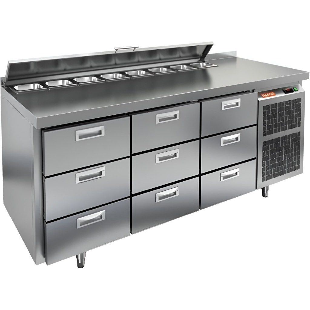 Каталог оборудования Холодильное оборудованиеСтолы охлаждаемыеСтолы холодильные для салатовСтол холодильный для салатов HiCold SL1-333GN (1/3) с крышкой Стол холодильный для салатов HiCold SL1-333GN (1/3) с крышкой Код товара: 064-847 Поделиться: WhatsAppTelegram СравнитьДобавить в КПВ избранное 0 305 992 ₽ В корзину 0 шт Под заказСамовывоз сегодня бесплатно Взять в кредит Купить в лизинг Получить консультацию в WhatsApp Описание Характеристики Отзывы 0 Стол холодильный для салатов HiCold SL1-333GN (1/3) предназначен для использования на предприятиях общественного питания и торговли. Он объединяет рабочую поверхность и охлаждаемый отсек, что делает его удобным решением для хранения, охлаждения и подготовки ингредиентов при приготовлении салатов, пиццы и других блюд. Такая конструкция позволяет повару работать быстрее и эффективнее, так как все необходимые продукты находятся под рукой. Корпус и столешница выполнены из прочной нержавеющей стали, устойчивой к коррозии и легко поддающейся санитарной обработке.Металлическая крышка защищает продукты от загрязнений и сохраняет их свежесть. Особенности модели: Электронная панель управления — точная настройка температурного режима. 9 выдвижных ящика — быстрое размещение и замена продуктов. Вместимость салат-бара — до 8 гастроемкостей глубиной до 100 мм. Автоматические доводчики — комфорт при загрузке/выгрузке. Легкозаменяемые магнитные уплотнители — надежная герметичность. Открытая агрегатная часть — быстрый доступ для обслуживания. Регулируемые по высоте ножки — устойчивость даже на неровном полу. Толщина столешницы, борта и теплоизоляции — 50 мм, что обеспечивает прочность и энергоэффективность конструкции. HiCold SL1-333GN (1/3) — практичное и удобное решение для профессиональной кухни, обеспечивающее удобную подготовку и хранение ингредиентов. Изображение товара, представленного на фото, может отличаться от его фактического вида. Показать все Габаритные размеры1835×700×850 ммДиапазон рабочей температурыот +2 до +10 °CРасположение агрегатаБоковое Материал столешницыНержавеющая Тип столаС ящиками Объём505 лТип гастроемкостейGN 1/3 Количество ящиков9 штНапряжение220 ВМощность0,46 кВтТип охлажденияДинамическое Тип оттайкиАвтоматическая СтолешницаС бортом Габариты в упаковке2000×850×1000 ммВес нетто130 кгВес брутто185 кгБрендHicold Оставить отзыв Еще никто не оставил отзыв на этот товар Ранее просмотрено Под заказ 149 302 ₽ Стол холодильный для салатов HiCold SLE2-111GN (1/6) О З без крышки Под заказ 204 922 ₽ Стол холодильный для салатов HiCold SL1-22GN (1/3) О с крышкой Под заказ 143 721 ₽ Стол холодильный для салатов HiCold SL1-11GN (1/3) О с крышкой Под заказ 201 502 ₽ Стол холодильный для салатов HiCold SLE3-22GN полипропилен, с крышкой В наличии Цена по запросу Компрессорно-конденсаторный блок Север AHM-NTZ068 Под заказ 133 282 ₽ Стол холодильный для салатов HiCold SLE3-11GN полипропилен, без крышки Под заказ 255 412 ₽ Стол холодильный для салатов HiCold SL1-222GN (1/3) О без крышки