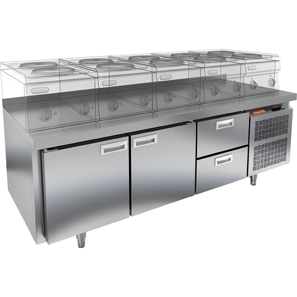 Стол оснащен двумя глухими дверями и четырьмя выдвижными ящиками, что обеспечивает удобный доступ к продуктам и рациональное использование внутреннего пространства. Оборудование идеально подходит для предприятий общественного питания.