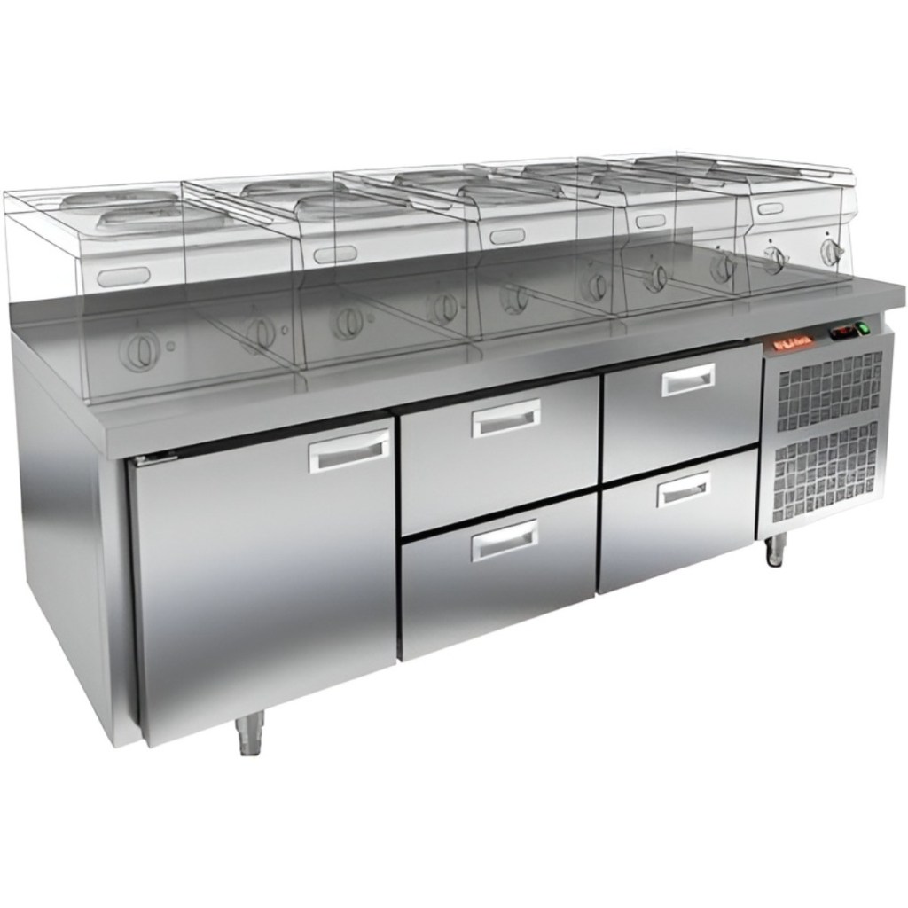 Стол оснащен одной глухой дверью и четырьмя выдвижными ящиками, что обеспечивает удобный доступ к продуктам и рациональное использование внутреннего пространства. Оборудование идеально подходит для предприятий общественного питания.