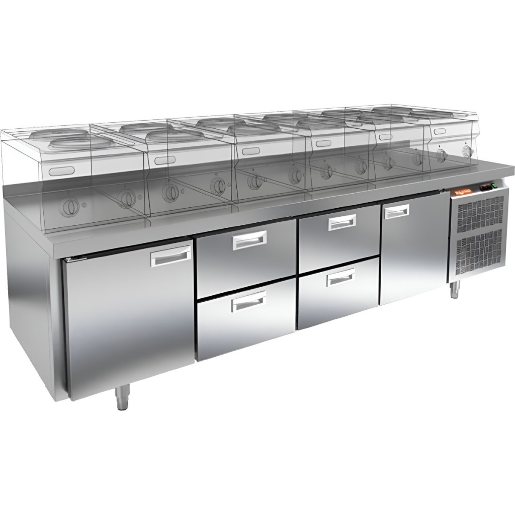 Стол оснащен двумя глухими дверьми и четырьмя выдвижными ящиками, что обеспечивает удобный доступ к продуктам и рациональное использование внутреннего пространства. Оборудование идеально подходит для предприятий общественного питания.