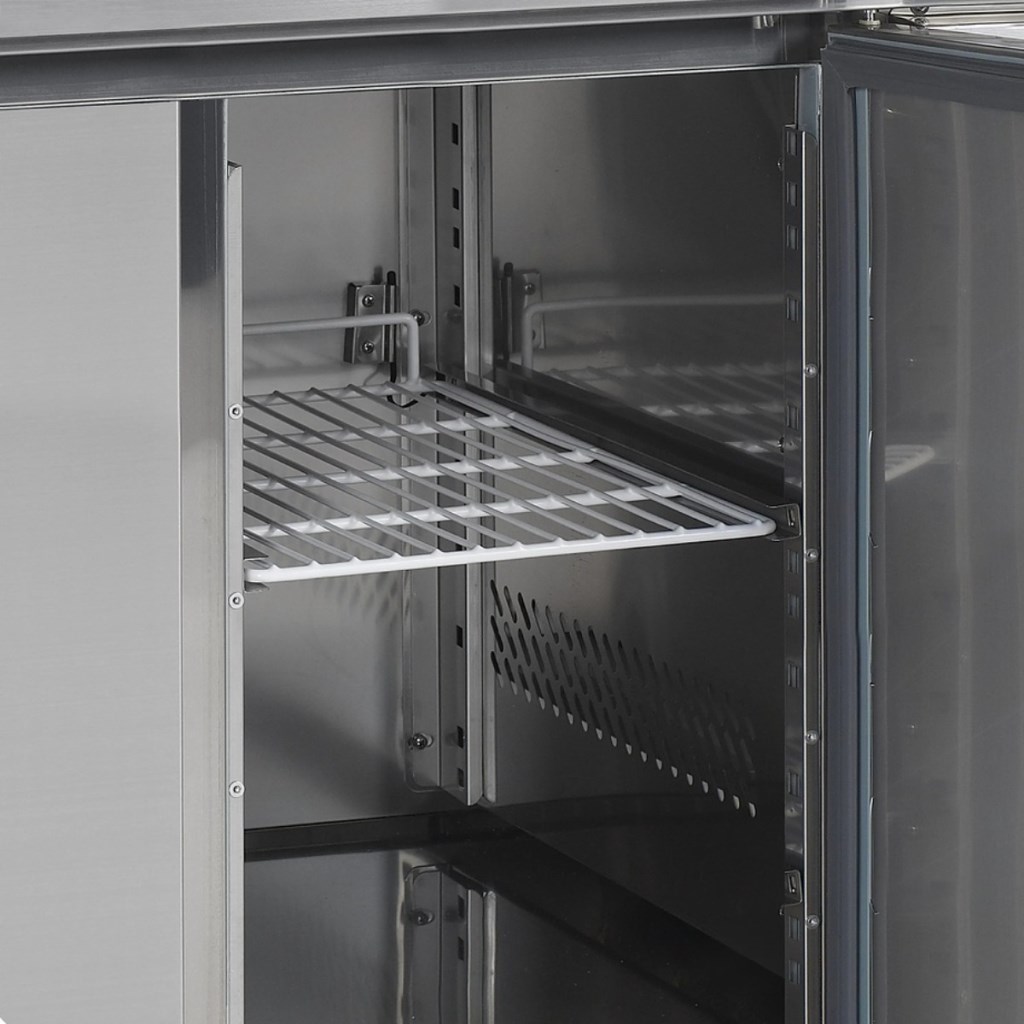 Каталог оборудования Холодильное оборудованиеСтолы охлаждаемыеСтолы холодильные среднетемпературныеСтол холодильный среднетемпературный TEFCOLD GC73 Стол холодильный среднетемпературный TEFCOLD GC73 Код товара: 066-723 Поделиться: WhatsAppTelegram 0 Цена по запросу Получить консультацию в WhatsApp Описание Характеристики Отзывы 0 Стол холодильный среднетемпературный TEFCOLD GC73 — профессиональный стол для раскатки теста, обработки ингредиентов и кратковременного хранения продуктов на предприятиях общественного питания. Корпус и внутренняя отделка выполнены из нержавеющей стали SS201, обеспечивая прочность и легкость в уходе. Особенности модели: Динамическое охлаждение для равномерной температуры Электронный контроллер для точной настройки Автоматическая оттайка для удобства эксплуатации 3 распашные самозакрывающиеся двери 3 решетчатые полки GN1/1 Регулируемые ножки для устойчивости Климатический класс 4 Энергоэффективность класса B Хладагент R600a (подзарядка 95 г) Общий объем 417 л, полезный 402 л Энергопотребление 2,45 кВт/сутки (годовое 894 кВт⋅ч) Уровень шума 42 дБ Размеры полок 328×430 мм, внутренние размеры 1337×530×589 мм TEFCOLD GC73 — надежный и удобный холодильный стол для профессиональных кухонь. Он сочетает долговечность, равномерное охлаждение и удобство работы, обеспечивая эффективное хранение и обработку ингредиентов на предприятиях общественного питания.Изображение товара, представленного на фото, может отличаться от его фактического вида. Показать все Габаритные размеры1795×700×980 ммДиапазон рабочей температурыот -2 до 10 °CРасположение агрегатаБоковое Материал столешницыНержавеющая Тип столаС дверьми Тип двериГлухая Общий объем417 лПолезный объем402 лКоличество дверей3 штКоличество полок3 штРазмер полки328×430 ммКлиматический класс4 Уровень шума42 дБНапряжение220 ВМощность0,3 кВтРасход электроэнергии в сутки2,45 кВт/сутТип охлажденияДинамическое Тип оттайкиАвтоматическая ХладагентR600a СтолешницаС бортом Габариты в упаковке1830×750×1010 ммВес нетто134 кгВес брутто151 кгБрендTefcoldВсе нержавеющие холодильные столы Все холодильные столы с бортом Оставить отзыв Еще никто не оставил отзыв на этот товар Ранее просмотрено В наличии Цена по запросу Стол холодильный среднетемпературный TEFCOLD CK7240 В наличии Цена по запросу Стол холодильный среднетемпературный TEFCOLD CK7220 В наличии Цена по запросу Стол холодильный среднетемпературный TEFCOLD CK7340
