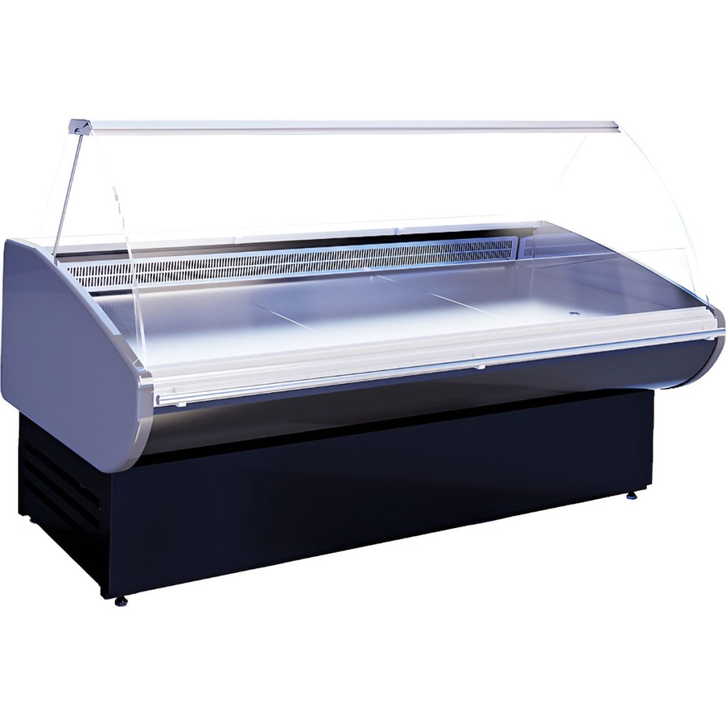 Модель оснащена изогнутым фронтальным стеклом, LED-подсветкой и просторной охлаждаемой камерой для хранения запаса товара. Экспозиционная и рабочая поверхности, а также бампер-отбойник выполнены из нержавеющей стали, теплоизоляция — из пенополиуретана.