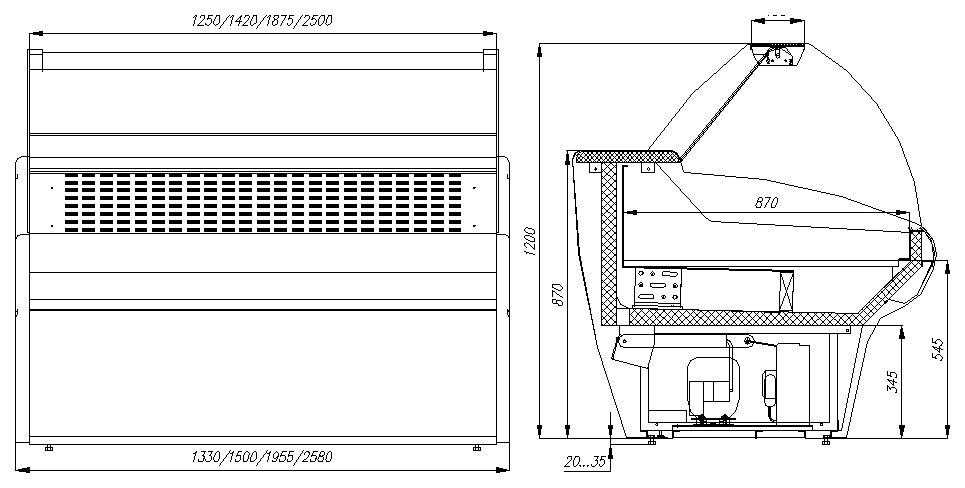 • Длина витрины без боковин 1420 мм — компактный размер, удобный для небольших торговых залов.